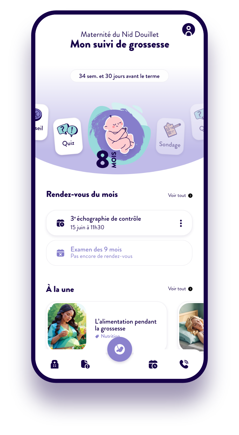 Tous les rendez-vous médicaux obligatoires sont centralisés au même endroit, accompagnés de rappels automatiques pour aider les parents à rester organisés tout au long de la grossesse.
